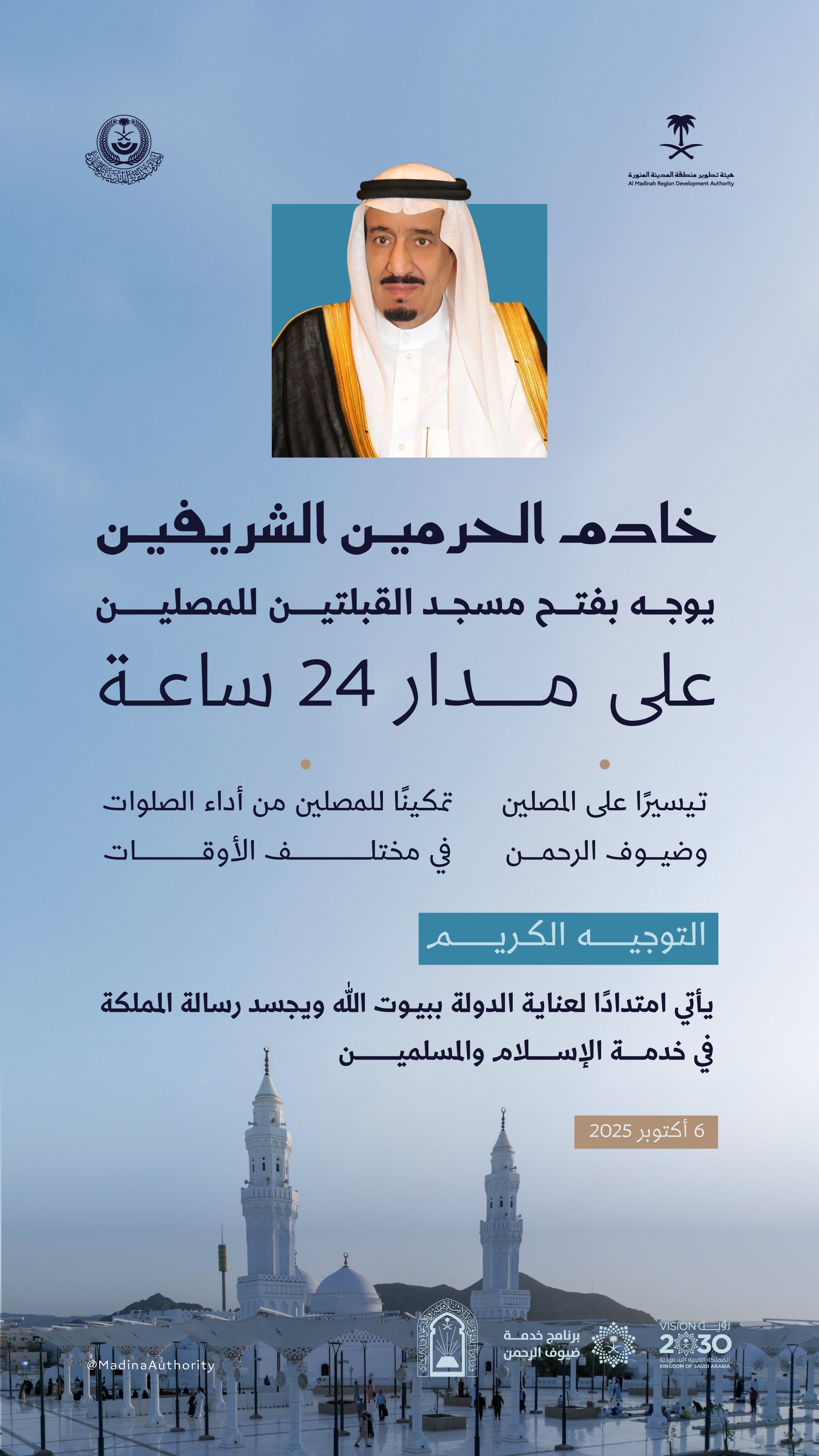 خادم الحرمين الشريفين يوجّه بفتح مسجد القبلتين على مدار (24) ساعة