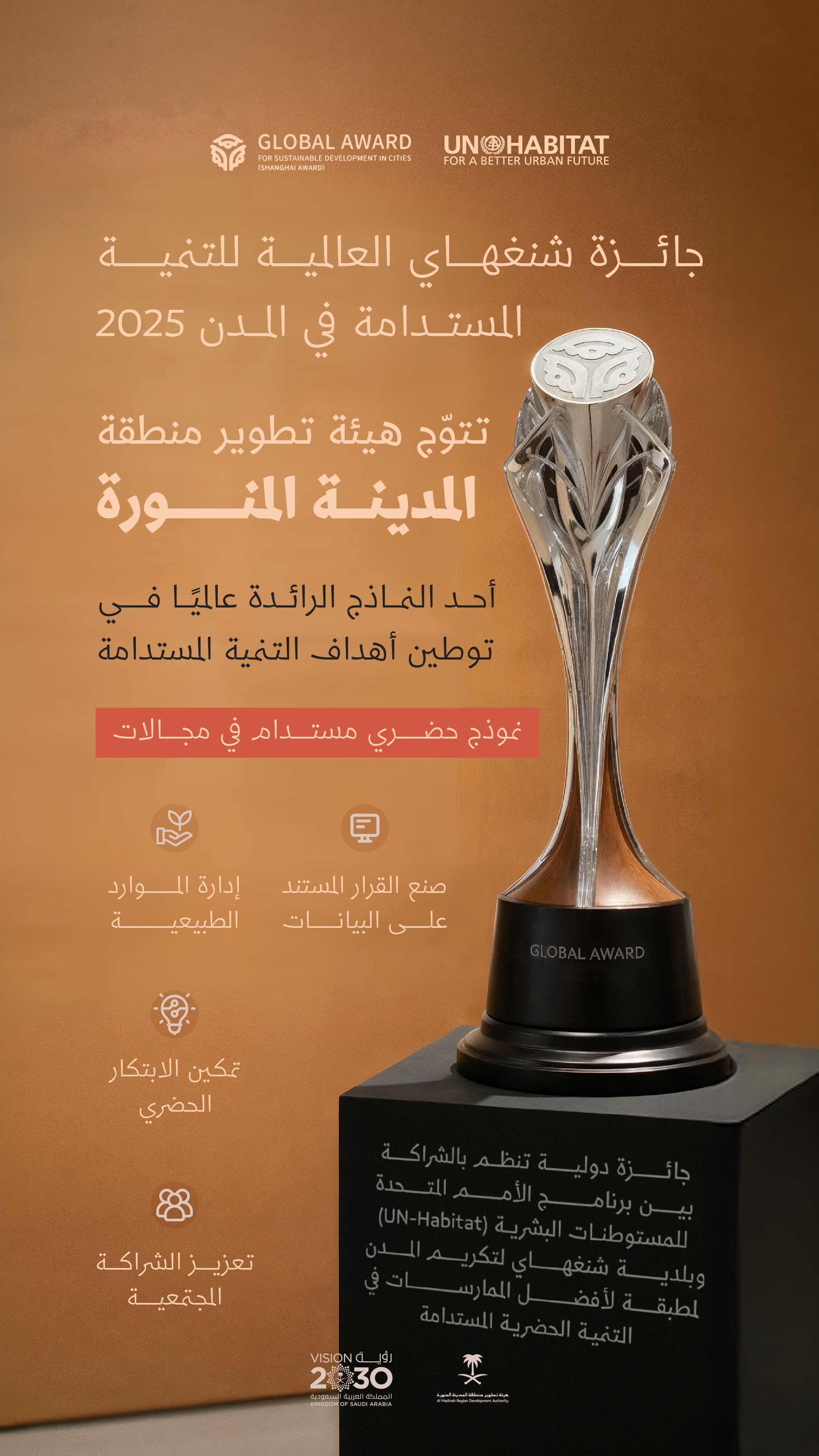 المدينة المنورة تُحقق جائزة شنغهاي العالمية للتنمية المستدامة في المدن 2025ِ