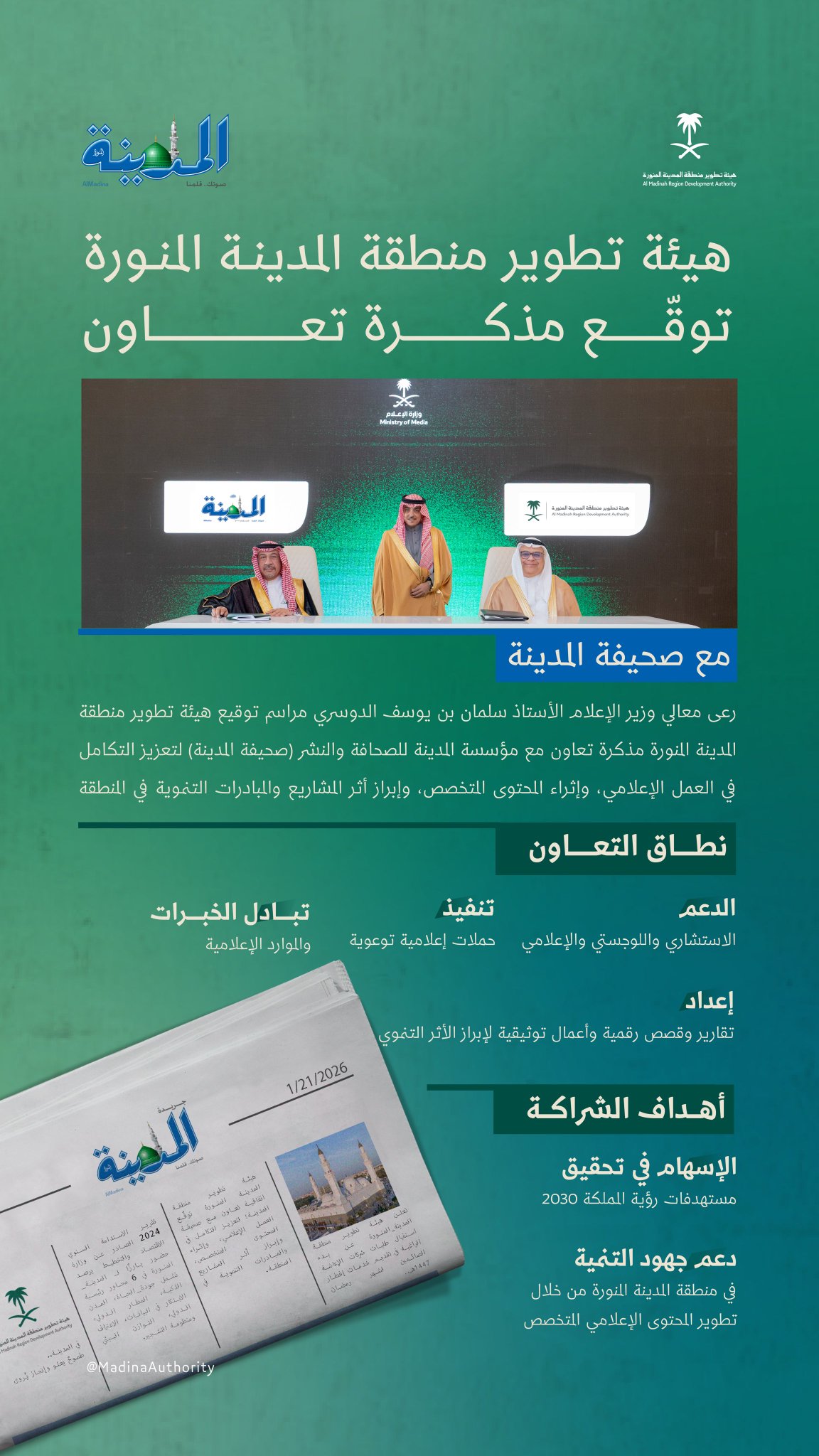 هيئة تطوير منطقة المدينة المنورة توقع مذكرة تعاون مع صحيفة المدينة